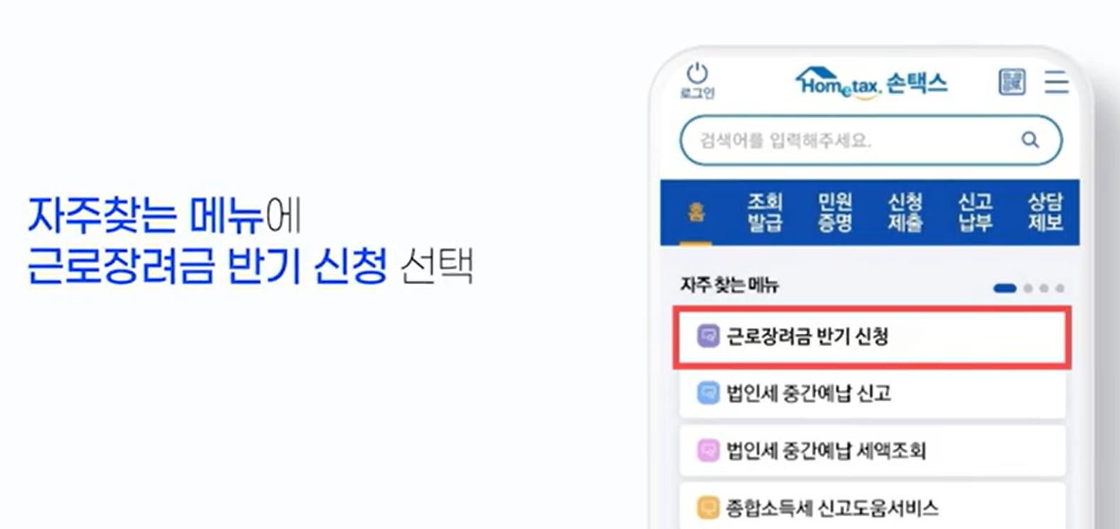 1) 홈택스 웹이나 앱에 접속을 합니다.  들어가셔서 `근로장려금 반기신청`을 클릭합니다.