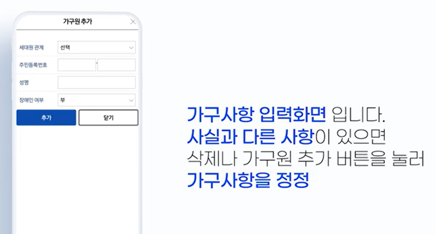 5) 인적사항을 입력하고 가구원들이 나오는데 맞는지 아닌지 확인하셔야 합니다.