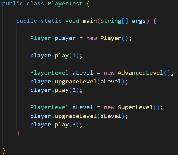 4) Player는 play() 중에 레벨에 있는 go(int count)라는 메서드를 호출하면 run()을 하고 count 횟수만큼 jump()를 하고 turn()한다.