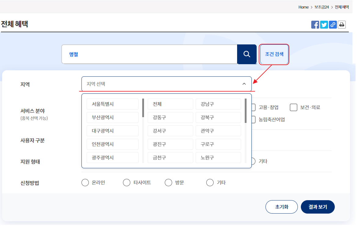 2) 검색란에 '명절' 혹은 '명절지원금', '명절위로금'을 작성하고 조건검색을 클릭하여 거주하고 있는 지역을 선택한다.
