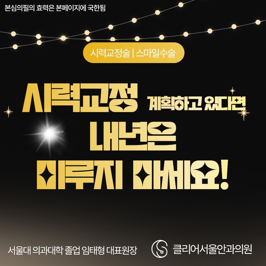 시력교정술을 고민하고 계셨다면 지금이 가장 좋은 타이밍입니다. 고가의 수술도 이번 할인 이벤트를 통해 보다 합리적으로 경험할 수 있으며, 국내 최고 수준의 의료진과 안전한 시스템까지 모두 갖춘 클리어서울안과에서 안심하고 수술받으세요.