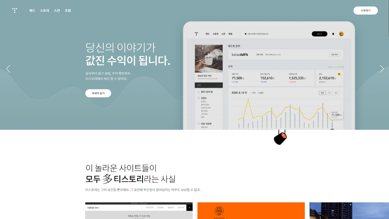 1. 티스토리 홈페이지에 들어갑니다. 메인 화면 우측 상단에 있는 시작하기를 클릭합니다.