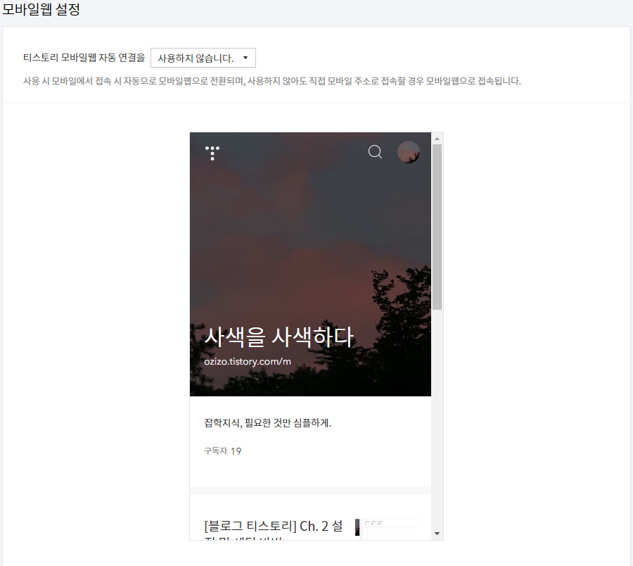 티스토리 모바일웹 자동 연결을 [사용하지 않습니다.]로 바꿔줍니다. *앱에서는 광고 송출이 되지 않기 때문에 웹으로 먼저 연결시킵니다.*