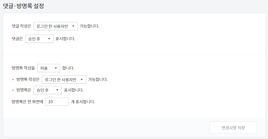 3. 다음은 댓글/방명록 관리에서 댓글/방명록 설정을 들어갑니다.