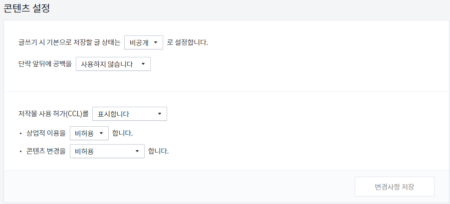 글쓰기 시 기본으로 저장할 글 상태는 [비공개]로 설정합니다.