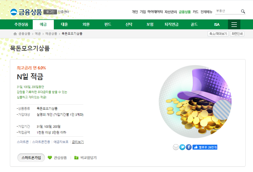 'N일 적금’은 네이버 웹툰 '유미의 세포들’과 협업하여 감정다이어리를 채우면 연 최고 6%의 금리를 받을 수 있는 재미있고 유익한 적금 상품입니다.