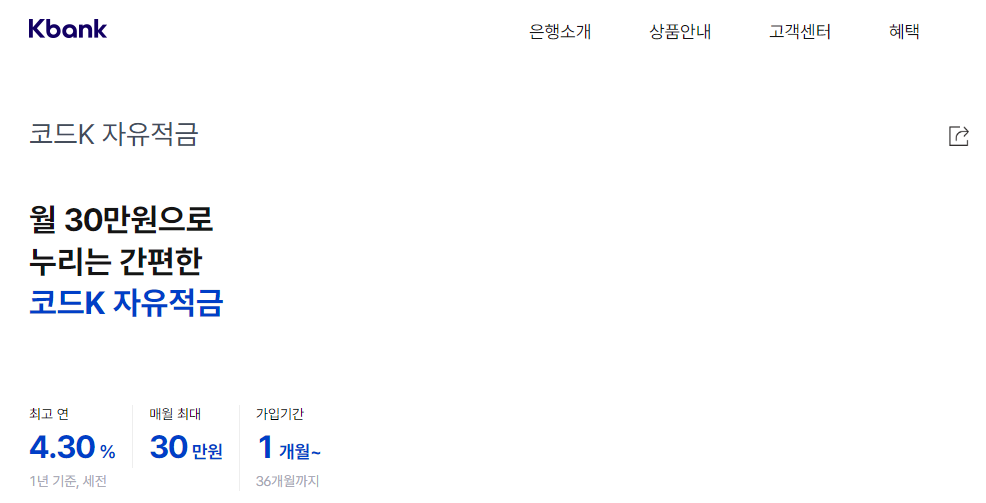 케이뱅크 코드K 자유적금은 케이뱅크에서 2022년 6월에 출시한 적금 상품으로, 1년 기준으로 연 4.3%의 높은 금리를 받을 수 있는 상품입니다.
