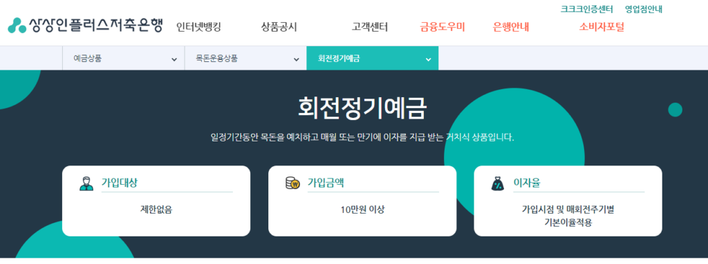 상상인저축은행 회전정기예금은 일정 기간 동안 특정 금액을 예치하여 높은 수익을 올릴 수 있는 거치식 예금 상품입니다. 12개월 주기로 자동 회전되는 회전정기예금은 가입 후 매 12개월 회전주기 단위로 약정이율이 변동되고, 원금 (이자금액 제외)만 회전되는 상품입니다.
